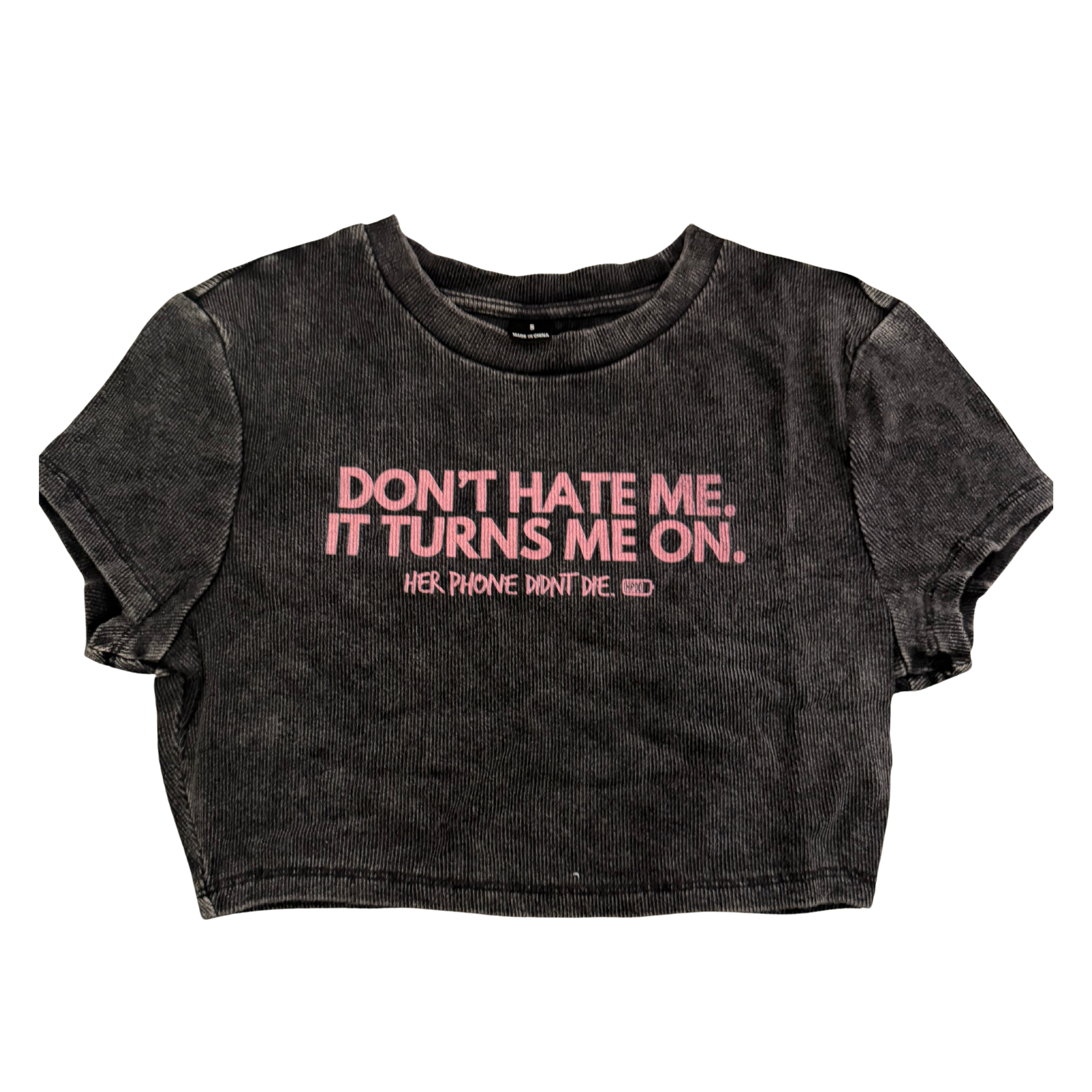 SHOP › DONT HATE ME. IT TURNS ME ON. (Ribbed material crop, stone washed black) Image 1 of 2 Image 2 of 2 DONT HATE ME. IT TURNS ME ON. (Ribbed material crop, stone washed black) $44.00 Add To Cart Added!